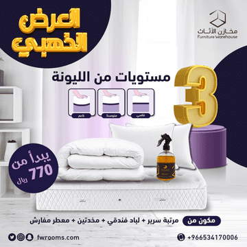 https://i.suar.me/AELPJ/s  العرض الذهبي للمراتب(مزدوج) هذه المجموعة المختارة بعناية ستوفر عليك عناءًا طويلاً، وستوصلك إلى النوم الهانئ والصحي من أقرب الطرق. لقد توصلنا في مخازن الأثاث إلى هذه المجوعة المتميزة بعد رحلة طويلة قمنا بها، من البحث والتجارب واستقصاء آراء العملاء، لكي نقدمها لك أخيراً بكل حب، وبسعر تنافسي مميز. سواءً كنت تحب النوم على مرتبة ذات ليونة أكثر، أو مرتبة ذات ليونة أقل، فسوف تجد درجة الليونة المناسبة لاحتياجك من خلال الاختيارات المتاحة. يتكون العرض الذهبي من 4 منتجات فاخرة:  1-مرتبة سرير مصنوعة من أجود أنواع الفوم، وبدرجات ضغط متفاوتة حسب رغبتك. هذه المرتبة مصنعة بترخيص من شركة ايفيريست الأمريكية، وبضمان سنتين. لذا لا داعي للقلق بشأن الجودة. 2-لباد مرتبة فندقي مصنوع من ألياف المايكروفايبر، مع تلبيس فاخر من القطن الطبيعي 100%. سيعطيك هذا اللباد إحساسًا فريدًا من الترف والرفاهية. 3-عدد 2 وسادة فندقية محشوة بألياف المايكروفايبر مع تلبيس فاخر من القطن الطبيعي 100%. 4معطر مفارش برائحة زكية تجعل السعادة تتسلل إلى داخلك. فقط أغمض عينيك وحلق بعيداً! هذه المنتجات الأربع التي قمنا باختيارها بعناية كفيلة بأن تحتويك وتمتص كل متاعبك بعد يوم متعب وشاق. ولعلمنا بأن لكل شخص تفضيلاته الخاصة، فقد وفرنا ثلاث اختيارات، ونحن نأمل أن تجد من بينها الاختيار الأفضل الذي يقدم لك أعلى مستويات الراحة. 1-ليونة أقل 2-ليونة متوسطة 3-ليونة أكثر لإختيار المقاسات و الإطلاع على المزيد إضغط على الرابط التالي : باقة النوم المريح https://i.suar.me/GVevg/s |